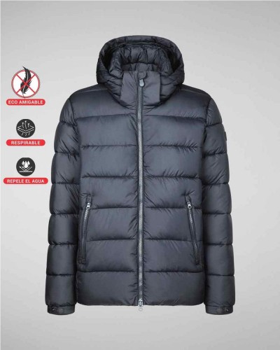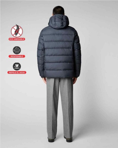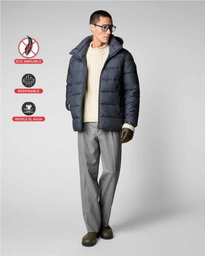 Chaqueta acolchada Save The Duck con capucha modelo Boris con cuello alto aislante tejido Plumtech usando pluma natural aislante Oeko-Tech totalmente ecológico fit regular mangas elásticas con dobladillo ofreciendo un ajuste más cómodo y cálido manteniéndote protegido del frio y viento
