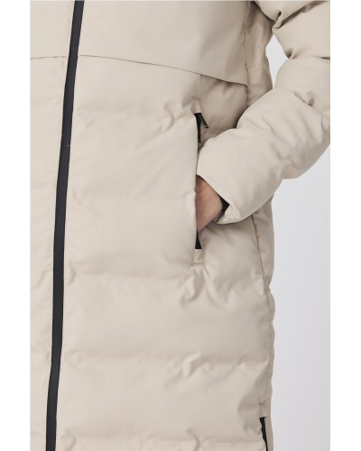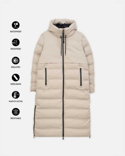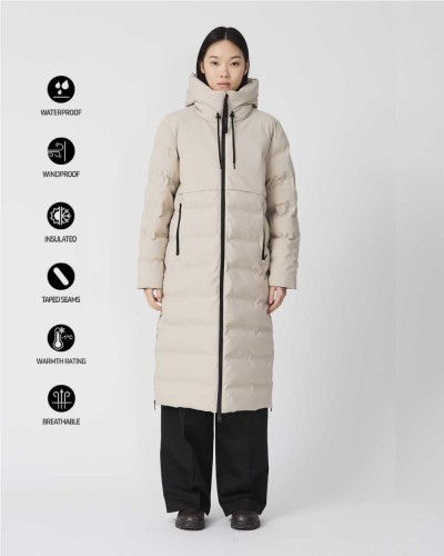 Abrigo largo Snestrom está diseñado para enfrentarse al invierno con estilo y protección. Fabricado en tejido de twill técnico completamente impermeable, incorpora una capa aislante sin plumas, ligera y transpirable, que mantiene el calor sin sacrificar la comodidad. Su diseño funcional incluye cremalleras impermeables laterales para mayor movilidad, bolsillos con cierre seguro y un canesú frontal en tejido liso que aporta un toque elegante y moderno. La cremallera frontal de doble cursor.