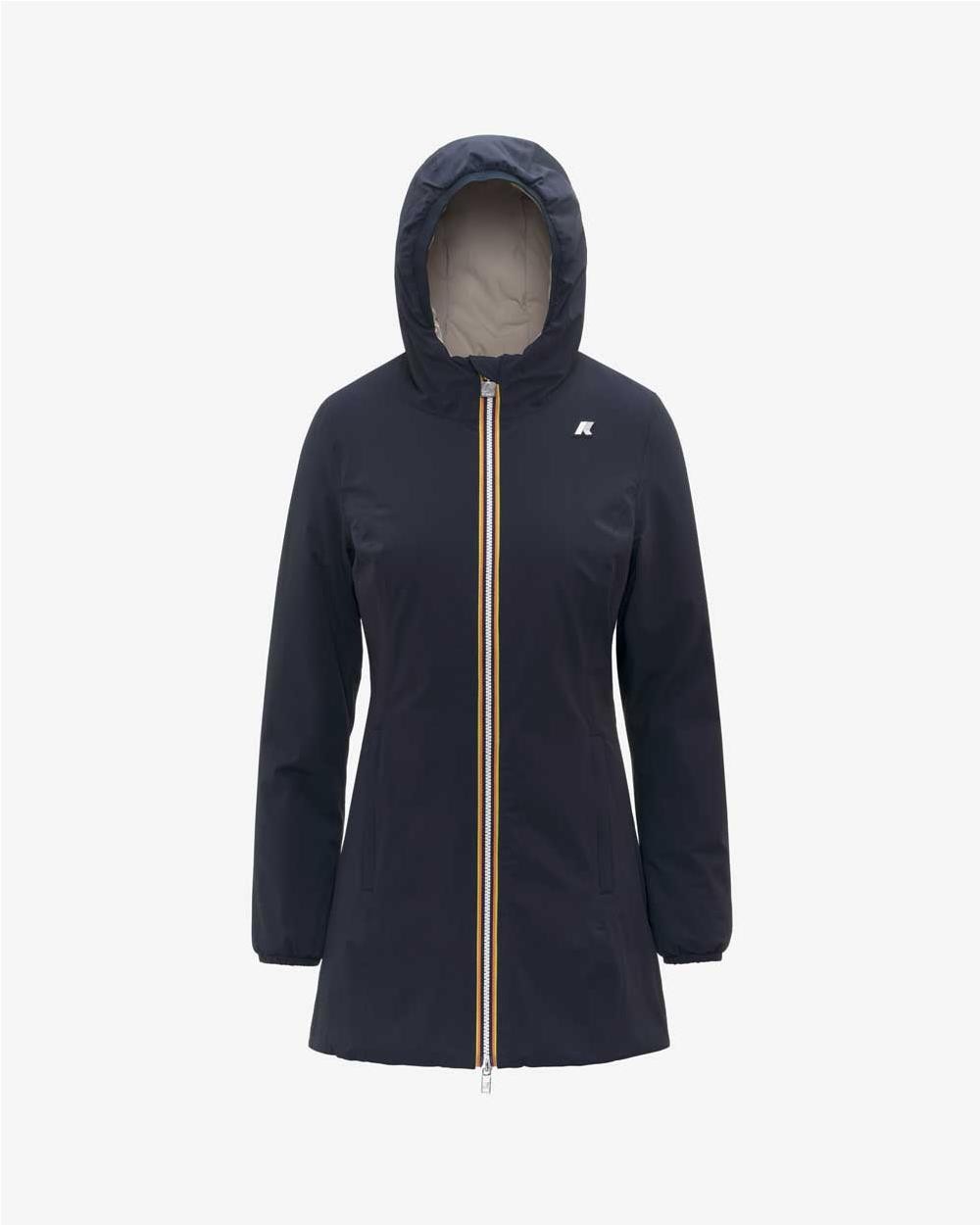 Chaqueta reversible K-Way Denise para mujer en color azul, ideal para entretiempo. De longitud media, combina un lado liso impermeable y otro estampado cortaviento. Ofrece calidez media gracias a su relleno sintético y costuras termoselladas. Con capucha ajustable, puños elásticos y 4 bolsillos funcionales. Corte entallado y femenino con logotipo K-Way en silicona blanca. Estilo y protección en una sola prenda versátil.