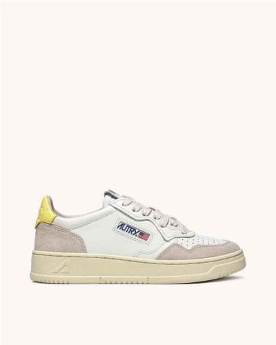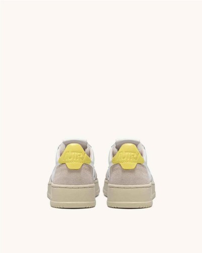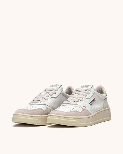 Zapatilla Autry Shoes modelo medallista parte superior cuero con inserciones tonales multicapa color blanco puntera perforada para una mayor transpirabilidad forro felpa y algodón. Talón acolchado color amarillo interior plantilla piel relieve 2 cm y suela goma con logo y altura 2,5 cm y 3,5 cm