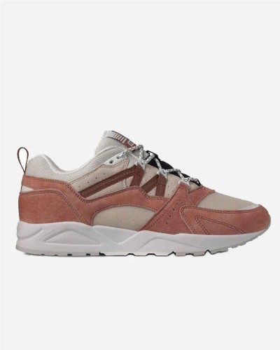 Zapatilla Karhu modelo estrella Fusion 2.0 llega a Cortemax en color mocha superposiciones de ante y cuero combinando diferentes tipos de malla y bylon balístico, mediasuela moteada con detalles reflectantes y tira de agarre