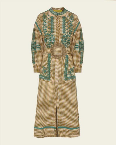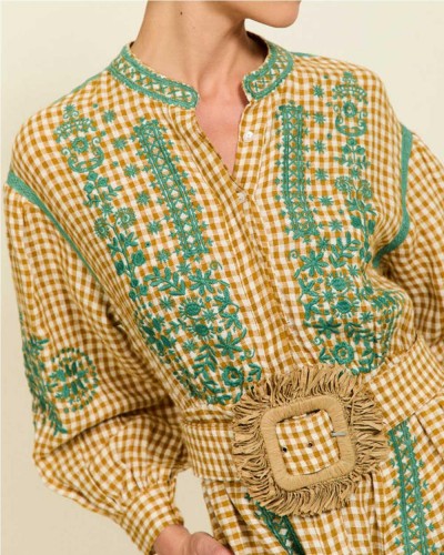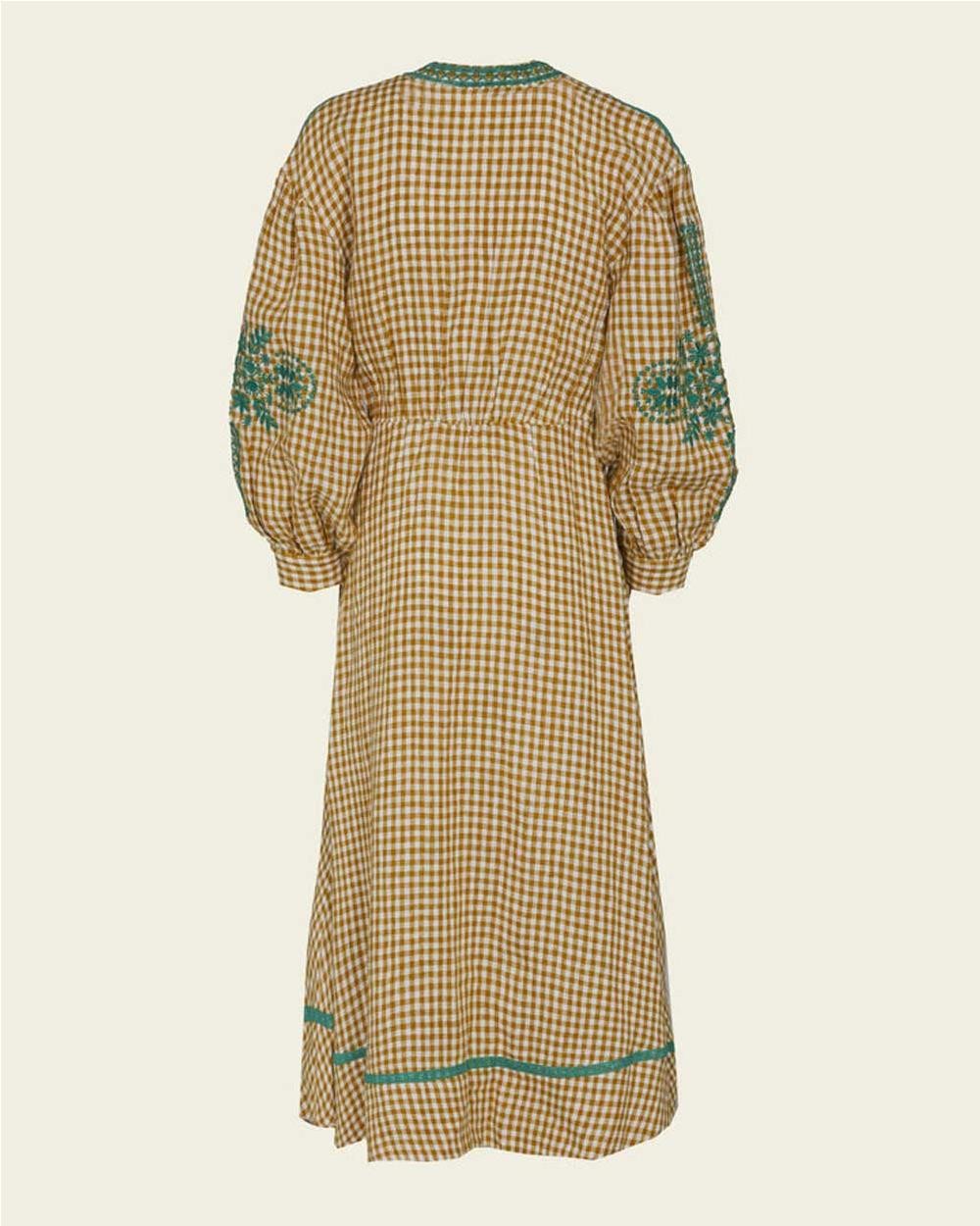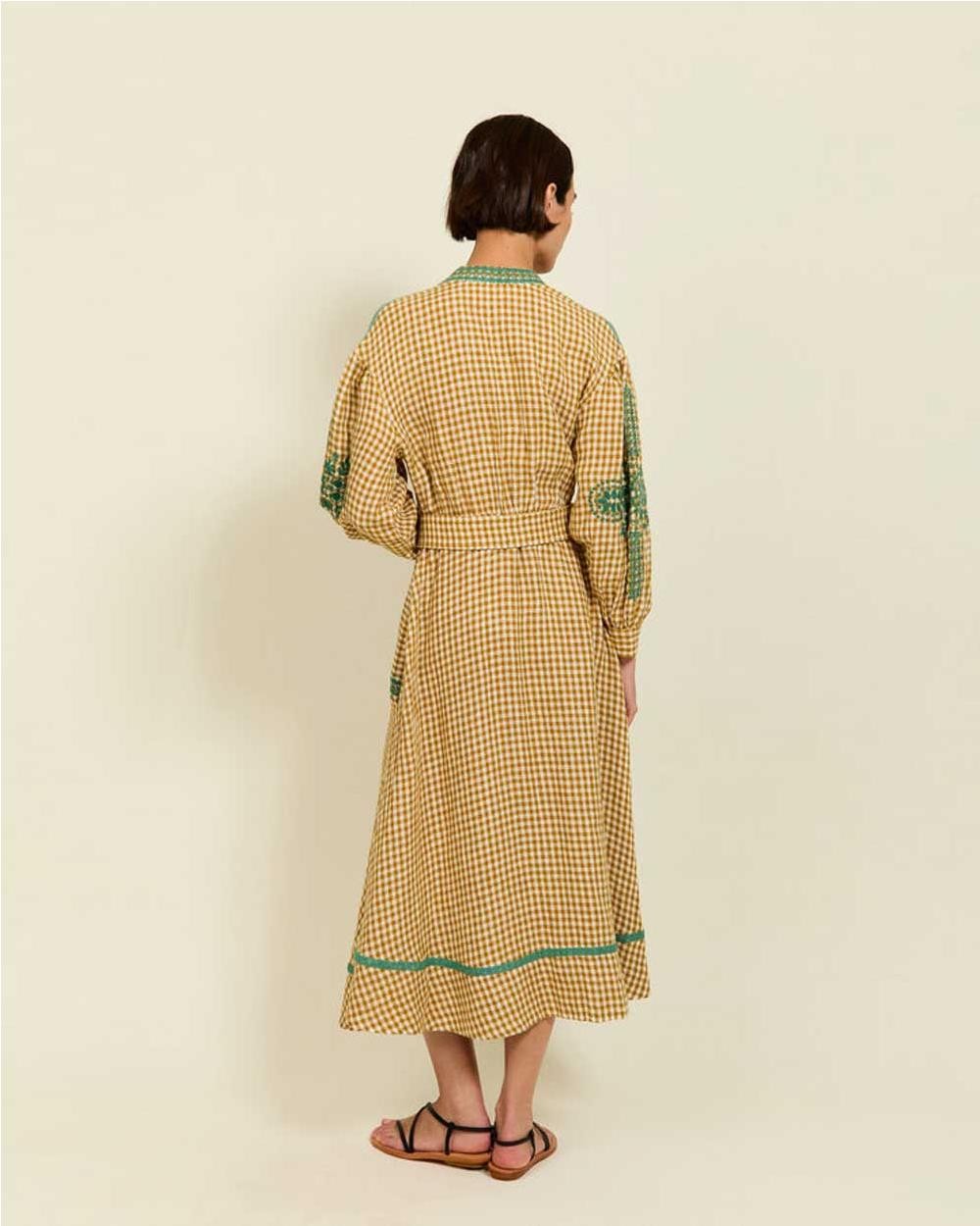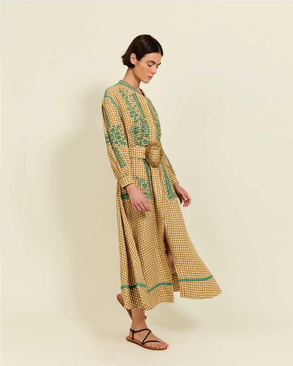 El vestido midi Philippa Mindy combina frescura, comodidad y estilo sofisticado. Confeccionado en lino 100% natural, ofrece ligereza y transpirabilidad, perfecto para días cálidos. Su estampado vichy en tono mostaza con bordados verdes crea un look moderno y elegante. El diseño de manga larga y escote ligeramente abierto aporta feminidad sin perder versatilidad. El cinturón a juego define la silueta, mientras que la falda midi fluida permite movimiento y comodidad en cada paso.
