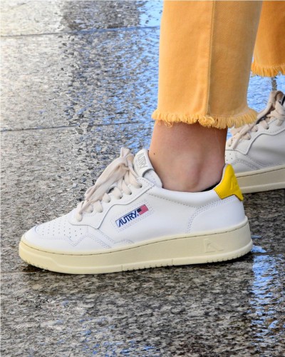 Zapatilla Medalist Autry bajas vintage tejido cuero vegano intersecciones multicapa cosidas forro piel y algodon lengueta piel al tono y talon amarillo acolchado plantilla piel 2 cm altura y suela de goma a juego con logo