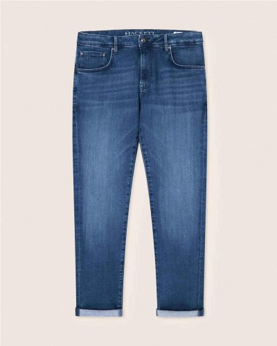 Pantalon denim Hackett London cinco bolsillos color azul capsula Aston Martin corte strech tejido elastico sus costuras detallas en los bolsillos traseros hechos por la tecnología Wish Wash cuidando el consumo del agua estos vaqueros atemporales perfecto para usar en cualquier momento o evento